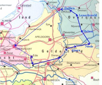 Vrijdag 6 mei: fietsen: Lemelerveld – Dalfsen (7 km); Treinen: Dalfsen – Zwolle – Amersfoort – Ede en tenslotte weer fietsen: Ede – Wageningen