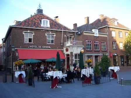 Door een mooi bosgebied gefietst naar de heuvels bij Groesbeek, langs de Mookerplas (terras bij het recreatiegebied) naar Gennep. Daar hadden we gereserveerd in Hotel De Kroon. Een leuk, oud hotel, in het centrum van Gennep. Met de fiets door de oude gelagzaal, naar achter. We hadden twee kamers boven in het hotel. De kamer van de meiden keek uit over de markt en het stadhuis.