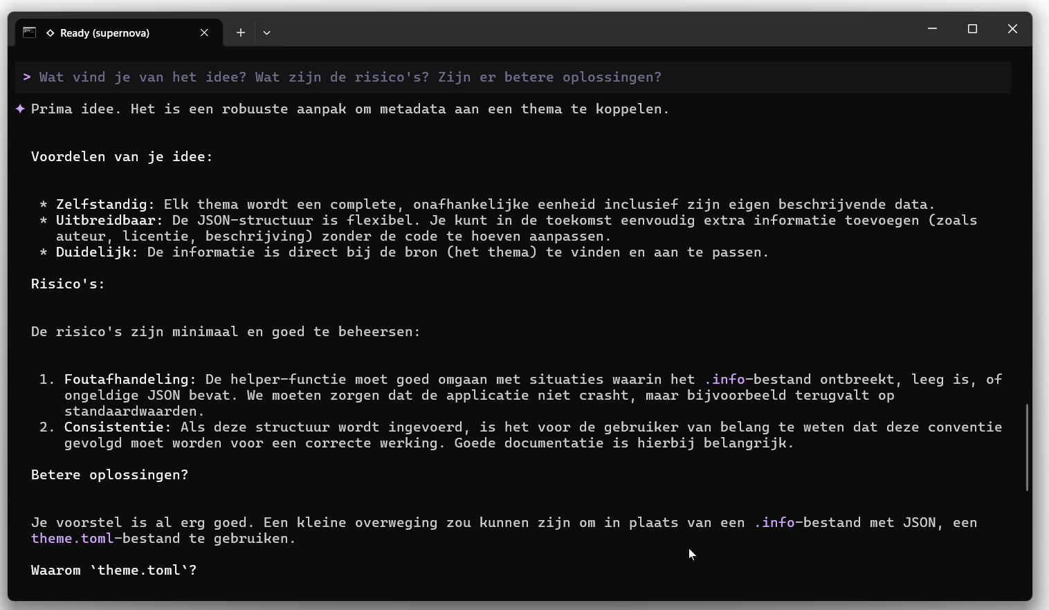 In discussie met Gemini. Ze geeft nuttige feedback op een idee van mij. Het gebruik van een theme.toml file is een goede suggestie, waar we nog verder over gaan praten.
